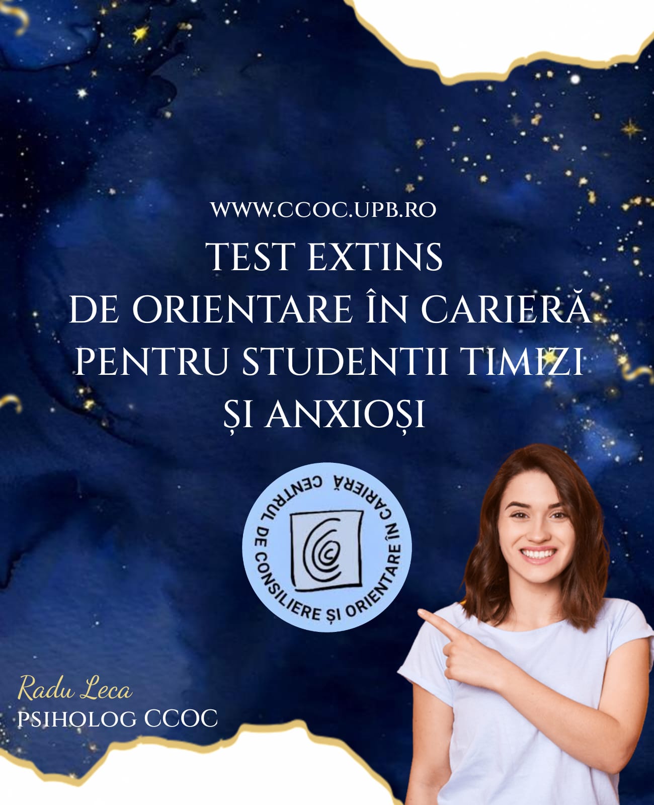 Psihologul Radu Leca a realizat un Test extins în două variante(scurt si complex) de Orientare în Carieră dedicat studenților anxioși tocmai pentru că, în practică, anxietatea schimbă regulile jocului atunci când iei decizii despre viitor.
